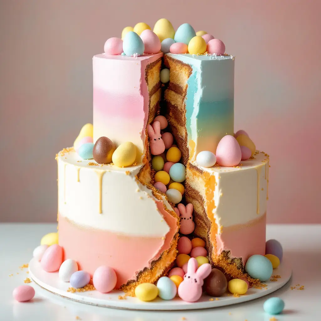 Easter Faultline Cake is a stunning centerpiece with layers of vibrant colors peeking through the frosting. This design creates an eye-catching illusion, perfect for showcasing sugary treats like chocolate eggs and pastel candies nestled in the fault line.