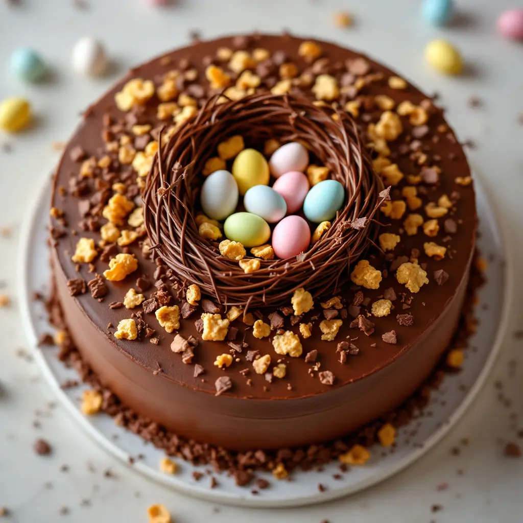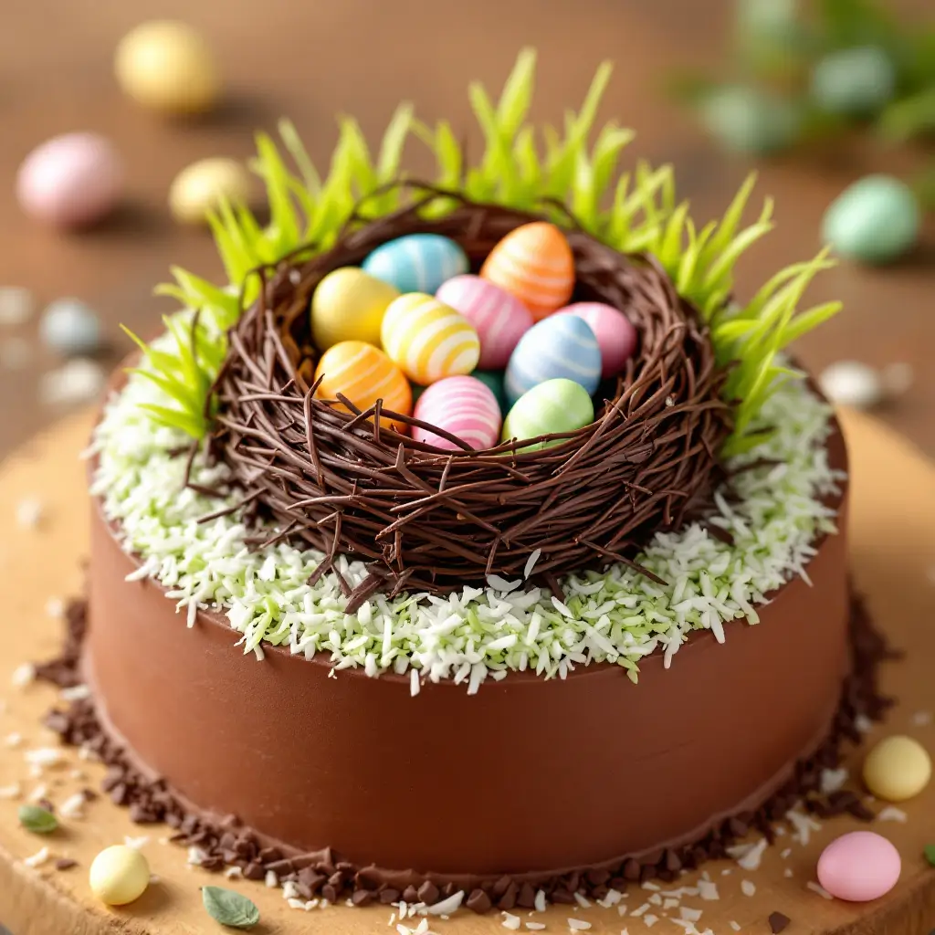 Transform your Easter chocolate cake with delightful nest decorations. Use shredded coconut or chocolate shavings as the base, then add colorful candy eggs and edible grass for a whimsical touch. Perfect for celebrating springtime sweetness!