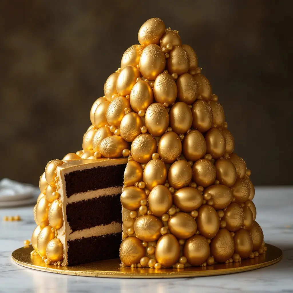 The Golden Egg Cake is a delightful Easter treat that sparkles with elegance. Decorated with shimmering golden chocolate eggs, it brings a festive touch to any celebration. Each slice reveals rich chocolate layers and surprises that everyone will love.