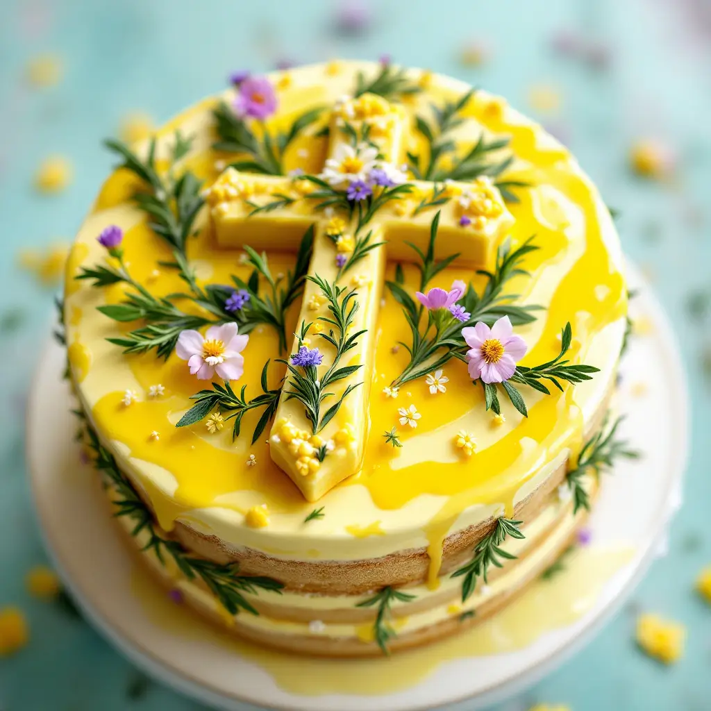 This refreshing cake blends zesty lemon with fragrant herbs, creating a unique twist. The cross design symbolizes spring’s renewal and adds an elegant touch, making it perfect for Easter gatherings or any festive occasion. It’s both delightful and visually stunning.