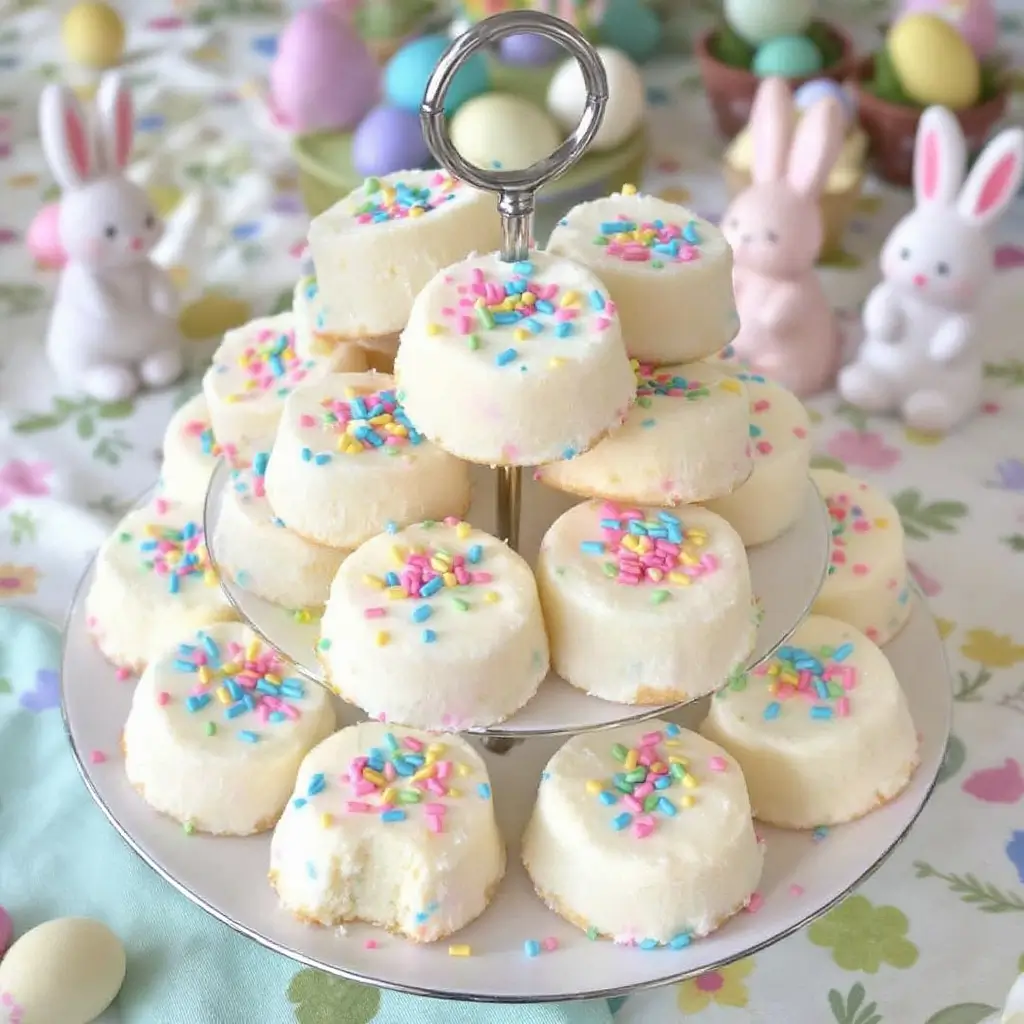 Mini confetti angel food cakes are light and airy, perfect for Easter celebrations. Their colorful sprinkles add whimsy to the classic dessert. Each bite feels like a celebration, making them an adorable treat for any festive gathering.