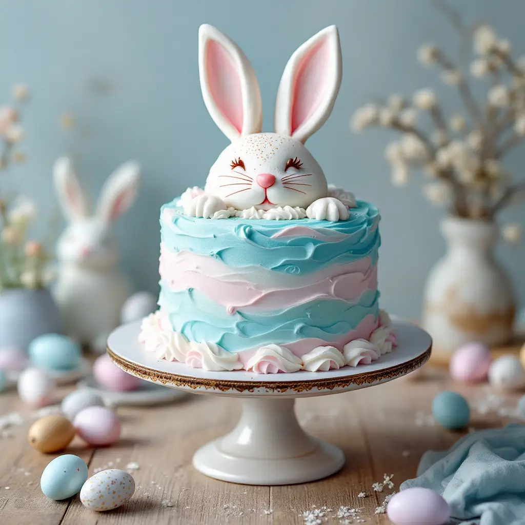 The Watercolor Bunny Cake is a delightful fusion of art and dessert. With pastel hues blending beautifully, this cake features a charming bunny design that captures the essence of Easter, making it perfect for festive celebrations and gatherings.
