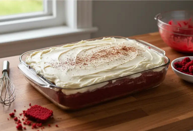 After baking and cooling your red velvet sheet cake, it’s time to add the final touches. This step is key as it adds flavor and beauty to your cake.