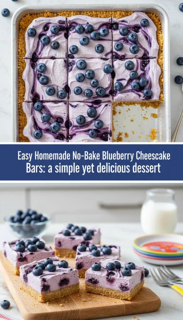 No-bake blueberry cheesecake bars are a great choice for dessert. They are easy to make and taste amazing. You get a crunchy graham cracker crust, creamy cheesecake, and sweet blueberries, all without baking.