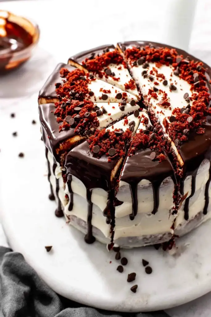 For those who prefer to avoid baking, a No-Bake Red Velvet Cake offers a hassle-free alternative. The layers of cake are made with crumbled Red Velvet cake mixed with cream cheese frosting and chilled until firm.