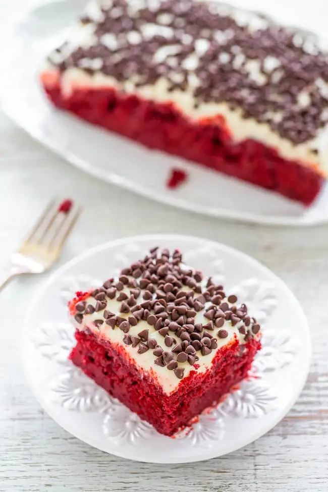 Adding chocolate chips to the classic Red Velvet cake gives it an extra pop of sweetness and texture. The chocolate chips melt into the cake, offering pockets of gooey chocolate that complement the soft, velvety crumb.